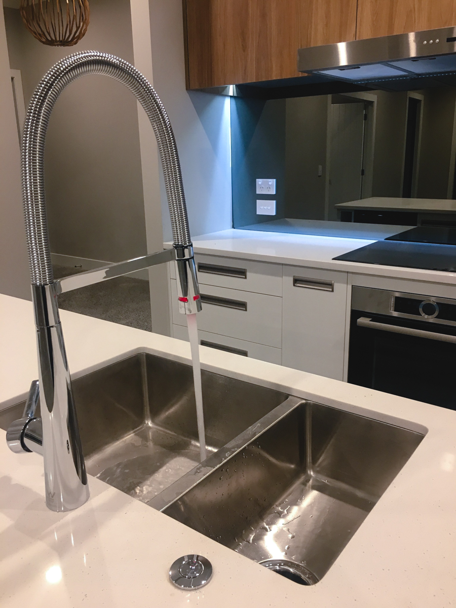 Amongst the house's many great features are a large scullery, spacious showers, a private backyard and covered patio. Throughout the home, glass splash backs have been used in the laundry and scullery to better compliment the design of the kitchen—they're also implemented along the bottom of the kitchen island to mirror the polished concrete floors.